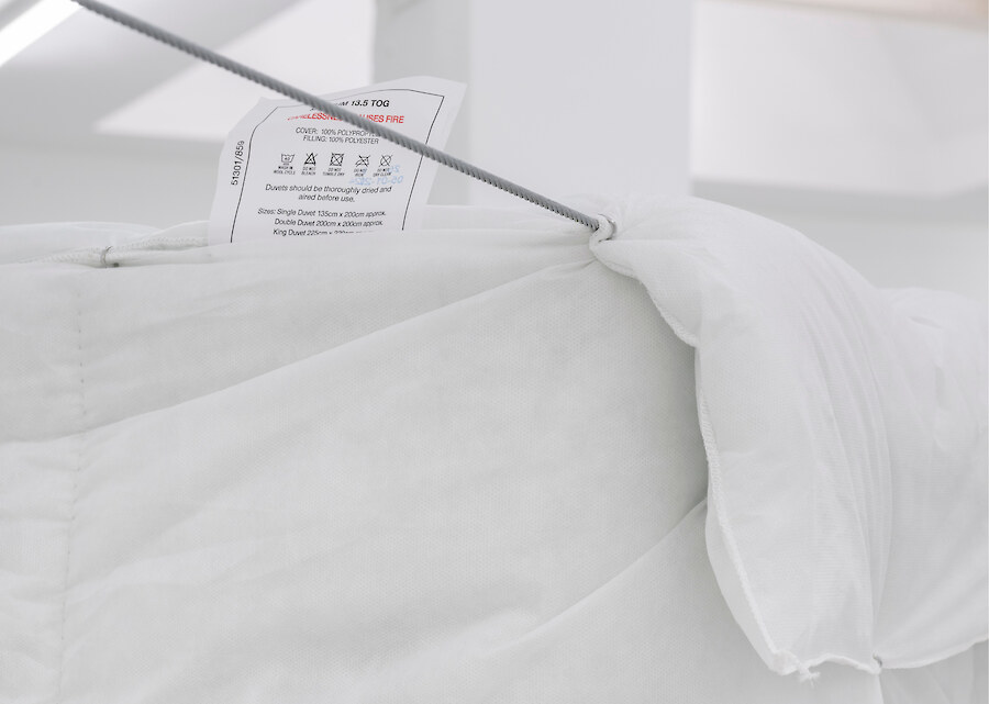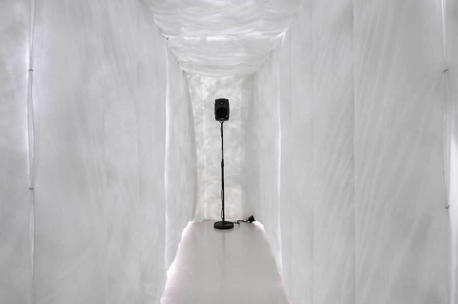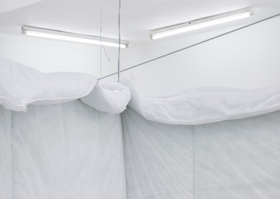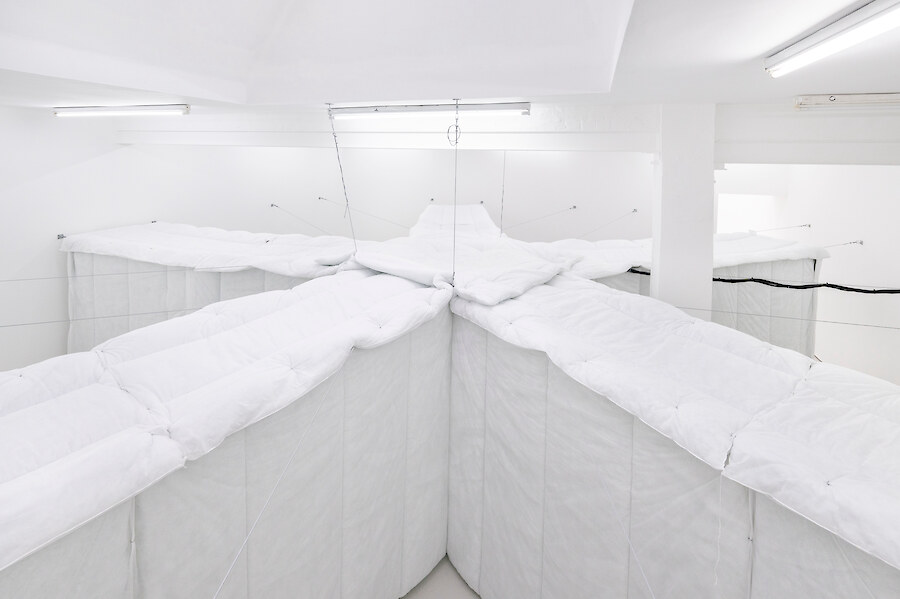 Radial arm maze made from synthetic duvets (15 single, 21 double), hog rings, high tensile steel cable, turnbuckles & hardware, 5 channel audio created from hundreds of vocal samples recorded by the artist 11:52 (looping). Sound design by Richy Carey, 2018-2024